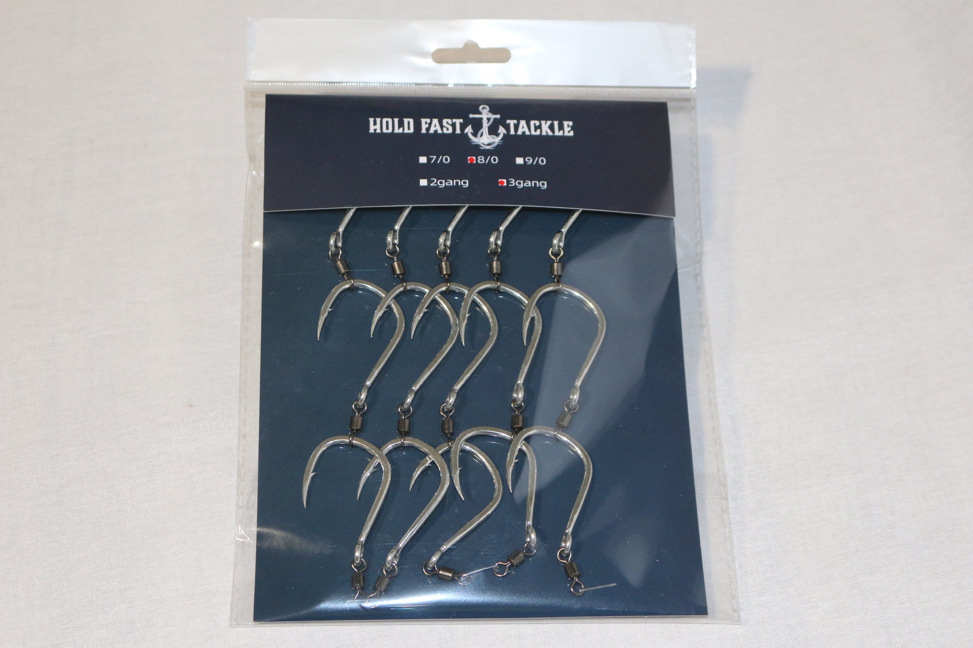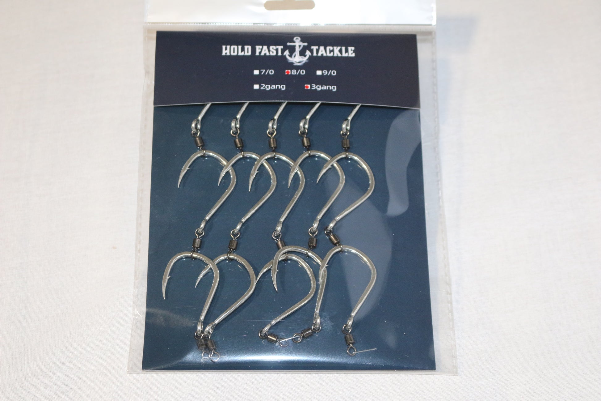 The 3 gang hooks are premium 5x strong hook designed for durability and performance. They are crafted from high carbon steel, nickel-plated to resist corrosion . The stainless rolling swivel are 80kg rated tuff built to handle Australia’s toughest fish